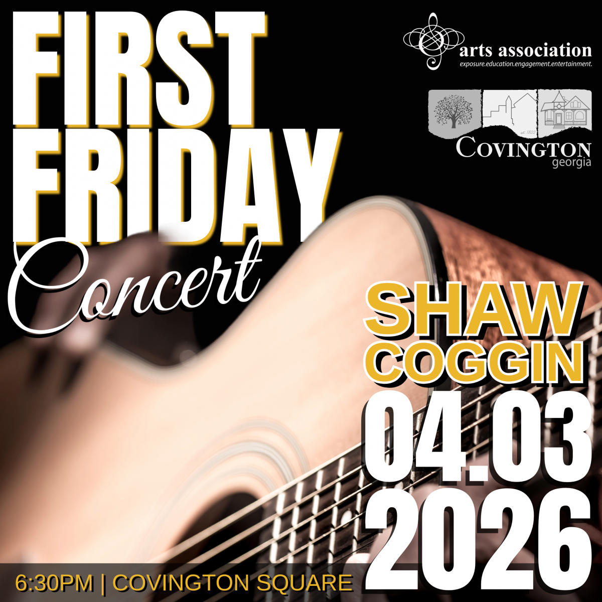 Enjoy music filling downtown Square Park with Shaw Coggin on Friday, April 3, 2026 for theApril's First Friday Concert on the Square. Shop, dine, and enjoy downtown Covington while Shaw entertains from the cement stage from 6:30 PM to 7:30 PM. Bring a chair or blanket to enjoy the concert to the fullest!