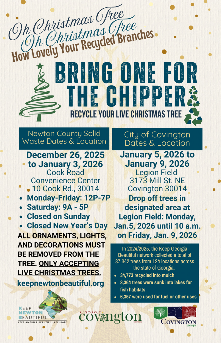 Recycle your live Christmas tree! There are two drop off locations available with varying times and dates. In partnership with Keep Newton Beautiful and Newton County Solid Waste, please look at the flyer to see times, dates, and location addresses for drop off at the Cook Road Convenience Center (final day for drop off is Saturday, 1/3/26 by 5 PM) or at Legion Field (final day for drop off is 1/9/26 by 10 AM). Only LIVE Christmas trees are accepted and they must be void of all lights and decorations.