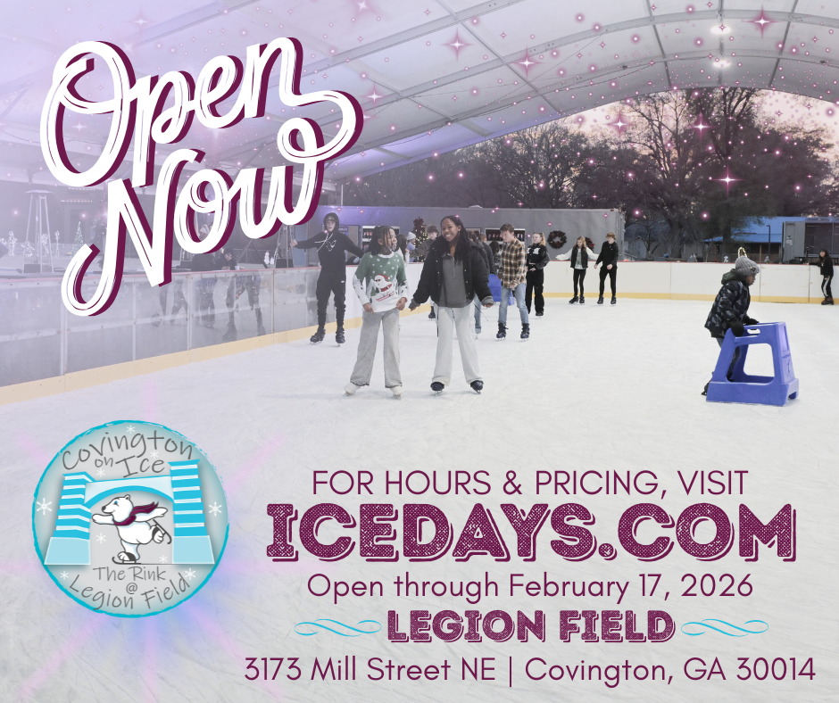 The Ice Days iceskating rink is open at Legion Field for the 2025-2026 holiday season. A fun outing on real ice during school breaks, on the weekends, and select week nights, experience the winter fun of ice skating in Covington, Georgia through Tuesday, February 17, 2026. For complete schedule and pricing, visit icedays.com.