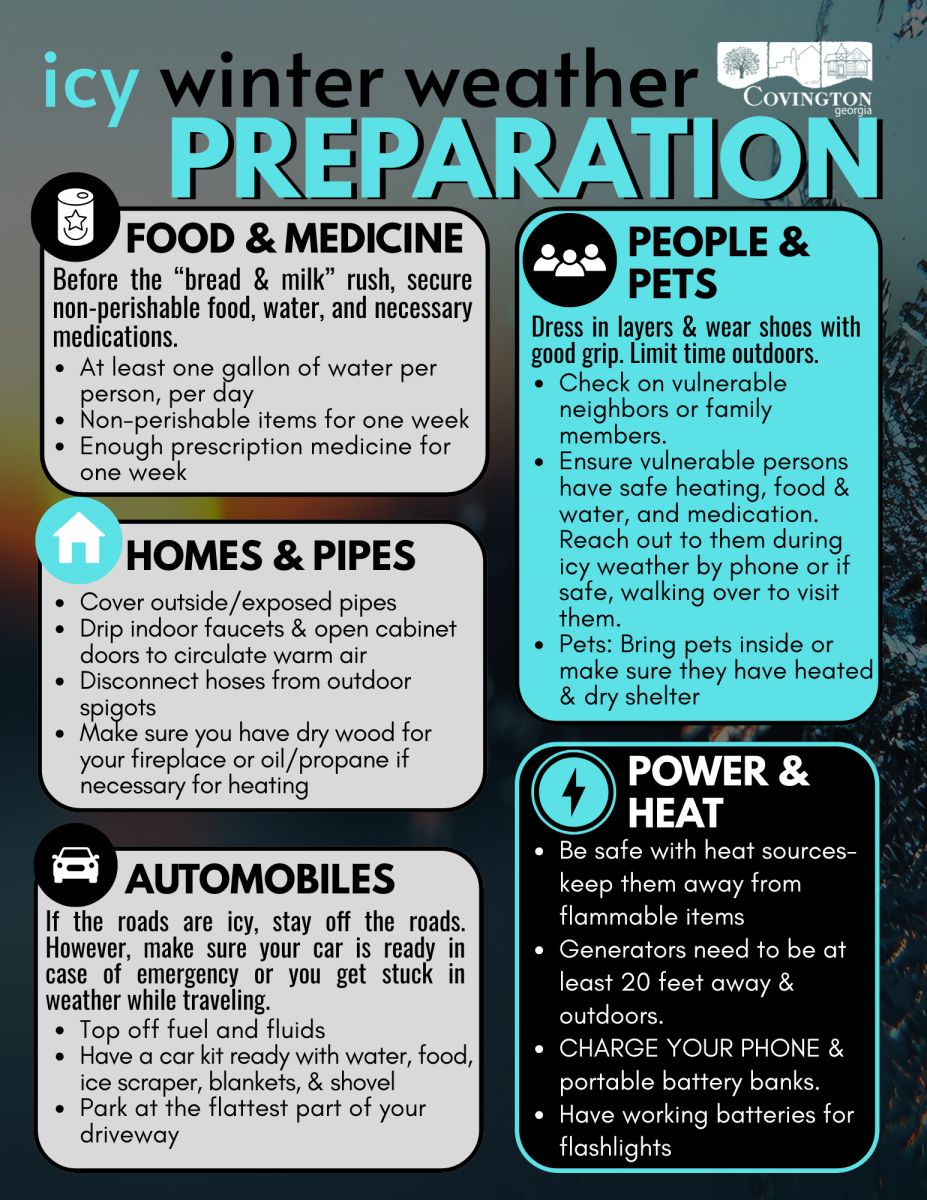 There's potential for icy winter weather on Saturday, January 24, and Sunday, January 25, 2026. Now is the time to prepare for the storm...even if the forecast changes, preparing now helps ensure the safety of your family, friends, and neighbors.