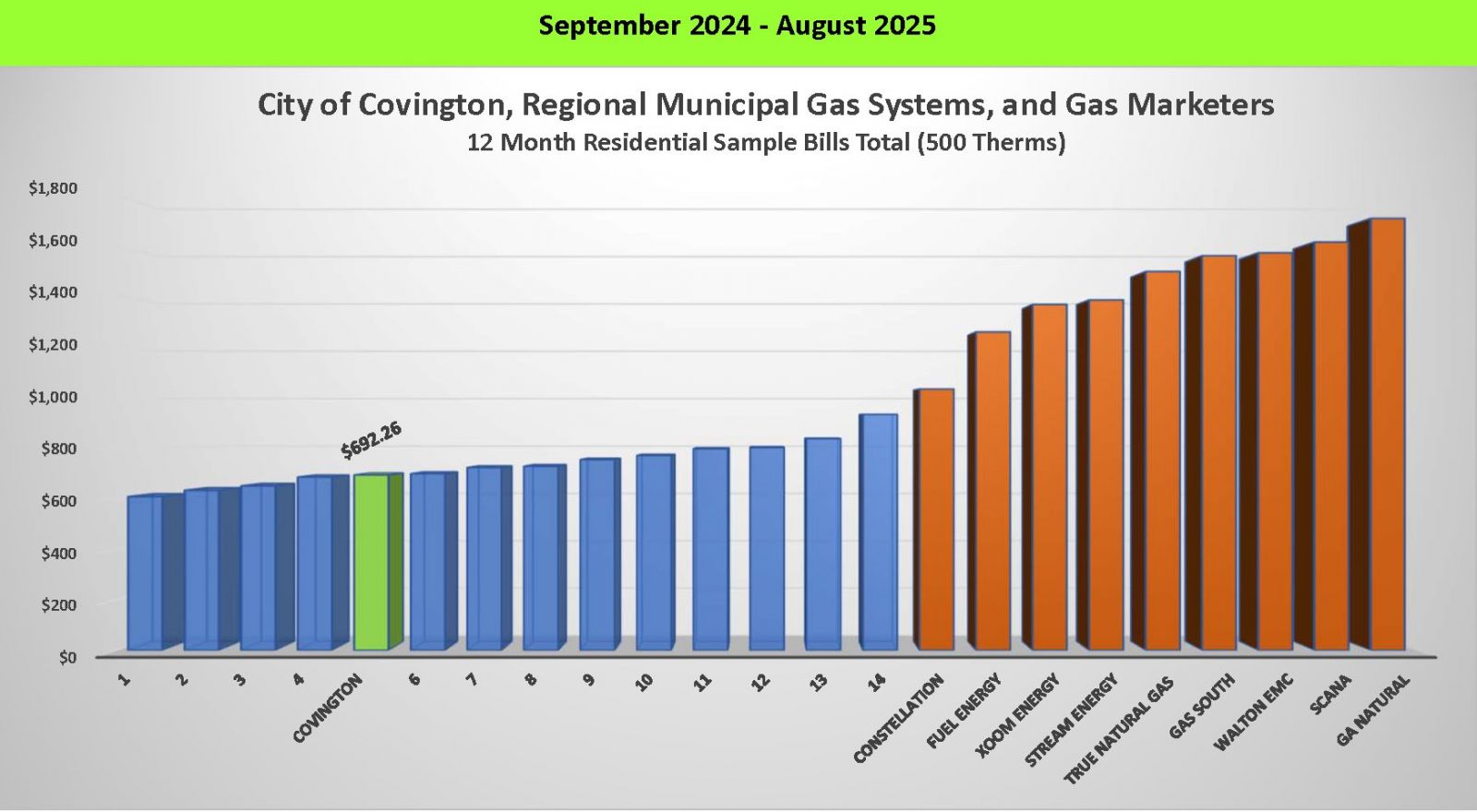 Below is a graph illustrating the difference in costs between the City of Covington and 11 other natural gas providers. The graph uses a 12 month bill average of 500 therms.